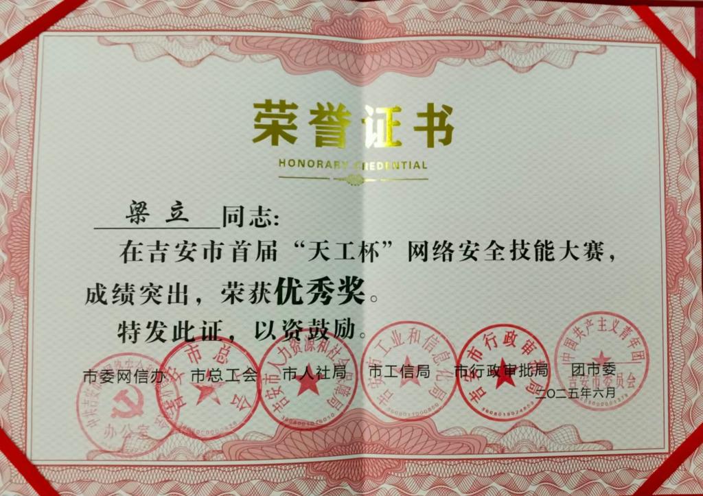 2025年6月25日,为充分挖掘各地各单位网络安全人才资源,由市委网信办、市总工会、市人社局、市工信局、市行政审批局、团市委等6部门联合主办的首届“天工杯”网络安全技能大赛决赛顺利落幕。井冈山大学附属医院信息技术科梁立、李伟中、孙欢三位同志组建名为“九天揽月”参赛队代表医院参加本次比赛。