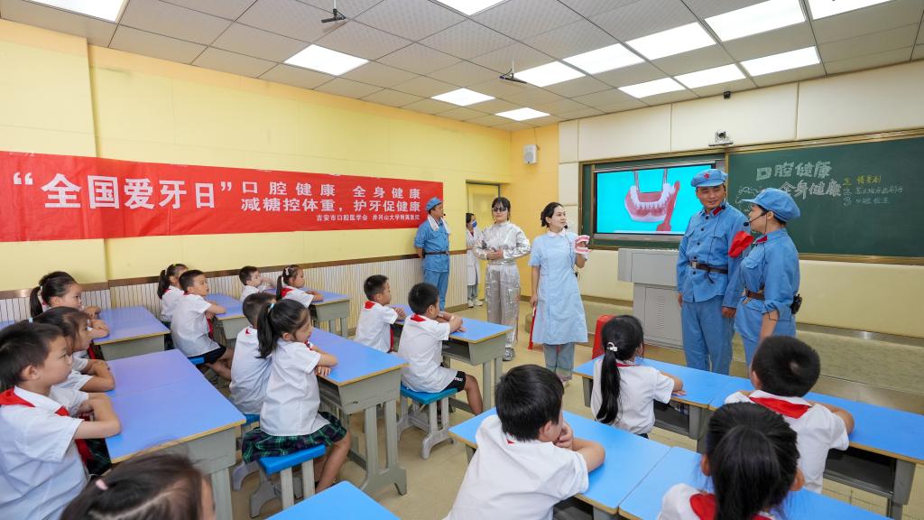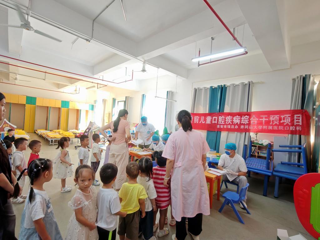 9月19日,口腔医护团队先后来到北门小学和永叔路小学。《闪闪红星,刷亮微笑》科普剧,让孩子们在欢声笑语中记住了刷牙方法和减糖的重要性。除了精彩的科普剧表演外,还开展了免费口腔检查服务,为学生们建立了口腔健康档案,并发放检查卡供家长了解孩子的牙齿健康状况。同期,医院还组织医护团队前往吉州区保育院等幼儿园,为幼儿提供免费涂氟服务,累计服务儿童2400余名,用实际行动守护儿童口腔健康。