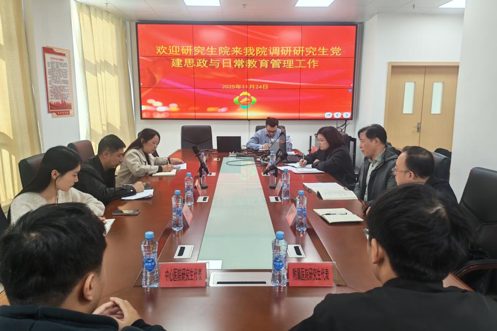 为深入贯彻落实立德树人根本任务,精准掌握研究生党建思政工作成效与日常教育管理工作难点,进一步优化工作机制、提升服务质量。11月24日,校研究生院副院长郭恺强、党委研究生工作部副部长张丹一行来附属医院(临床医学院)开展临床医学研究生党建思政与日常教育管理工作专项调研。院党委副书记李明敏,院党委委员、副院长曾俊权,科教科(学科与研究生办公室)负责人及临床医学研究生代表参加调研会。
