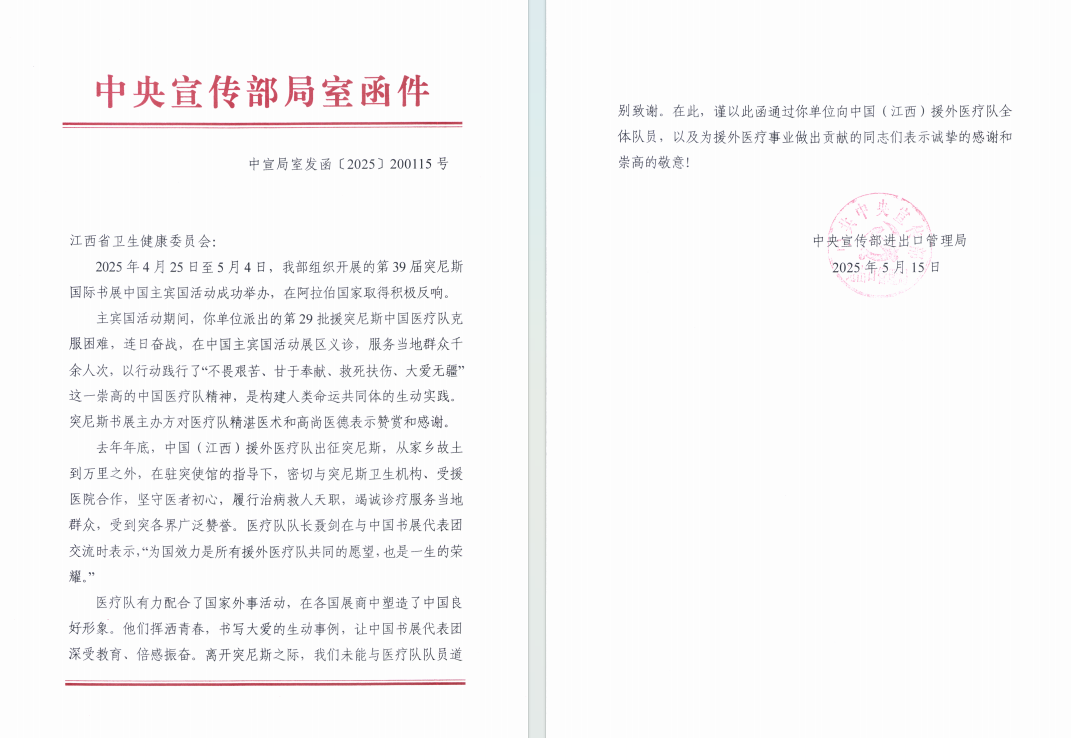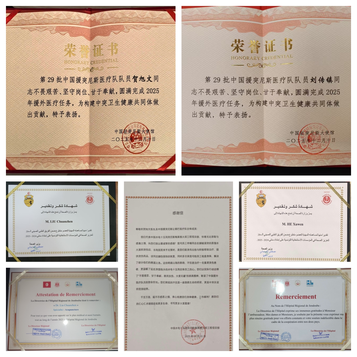 据了解,此次援外任务由国家及省、市卫生健康委统一部署。援外期间,医疗队整体工作成效显著,表现突出,集体荣获突尼斯卫生部、中华人民共和国外交部驻突尼斯共和国大使馆和中央宣传部进出口管理局分别致函表扬,充分体现了各方对医疗队工作的高度认可。