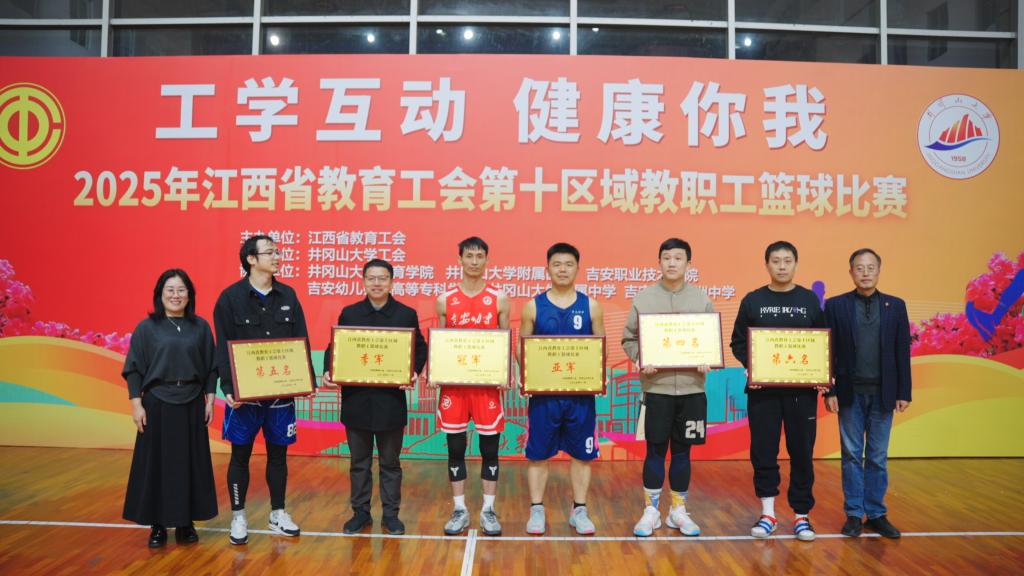 11月22日,2025年江西省教育工会第十区域教职工篮球赛在井冈山大学体训馆正式开赛,共计9支参赛队伍参加,经历7天21场紧张激烈的比赛,井冈山大学附属医院篮球队荣获第五名。